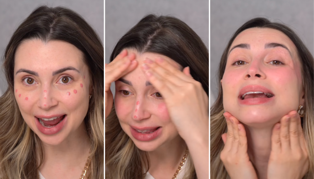 Na hora de aplicar, a veterana usa os dedos e aproveita o resto de produto para colorir um pouco a testa, bem rente ao cabelo, e contorno do maxilar. A cor eleita por Ana Paula é um tom de rosa levemente alaranjado, o que lembra muito o tom 74 da marca.